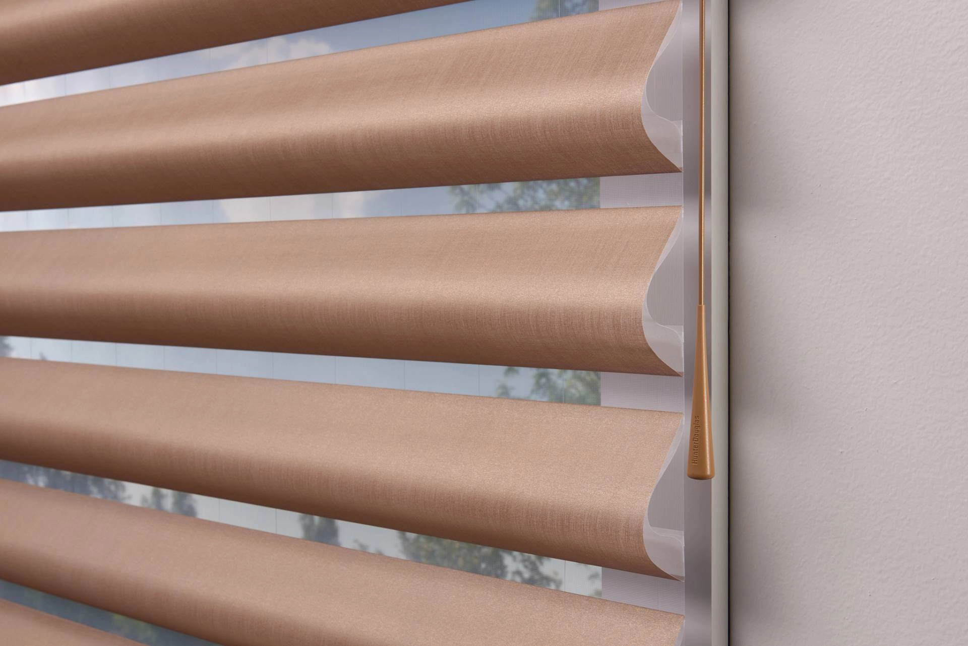As a hybrid window covering, Pirouette® Sheer Shades feature the benefits of sheers and blinds in one product. The soft fabrics complement French doors and filter light gently; attached to one sheer shade, horizontal fabric vanes seemingly float and provide coverage. You adjust the vanes to manage light or close them for privacy—the vanes move together. You can also raise them into the headrail for unobstructed views.